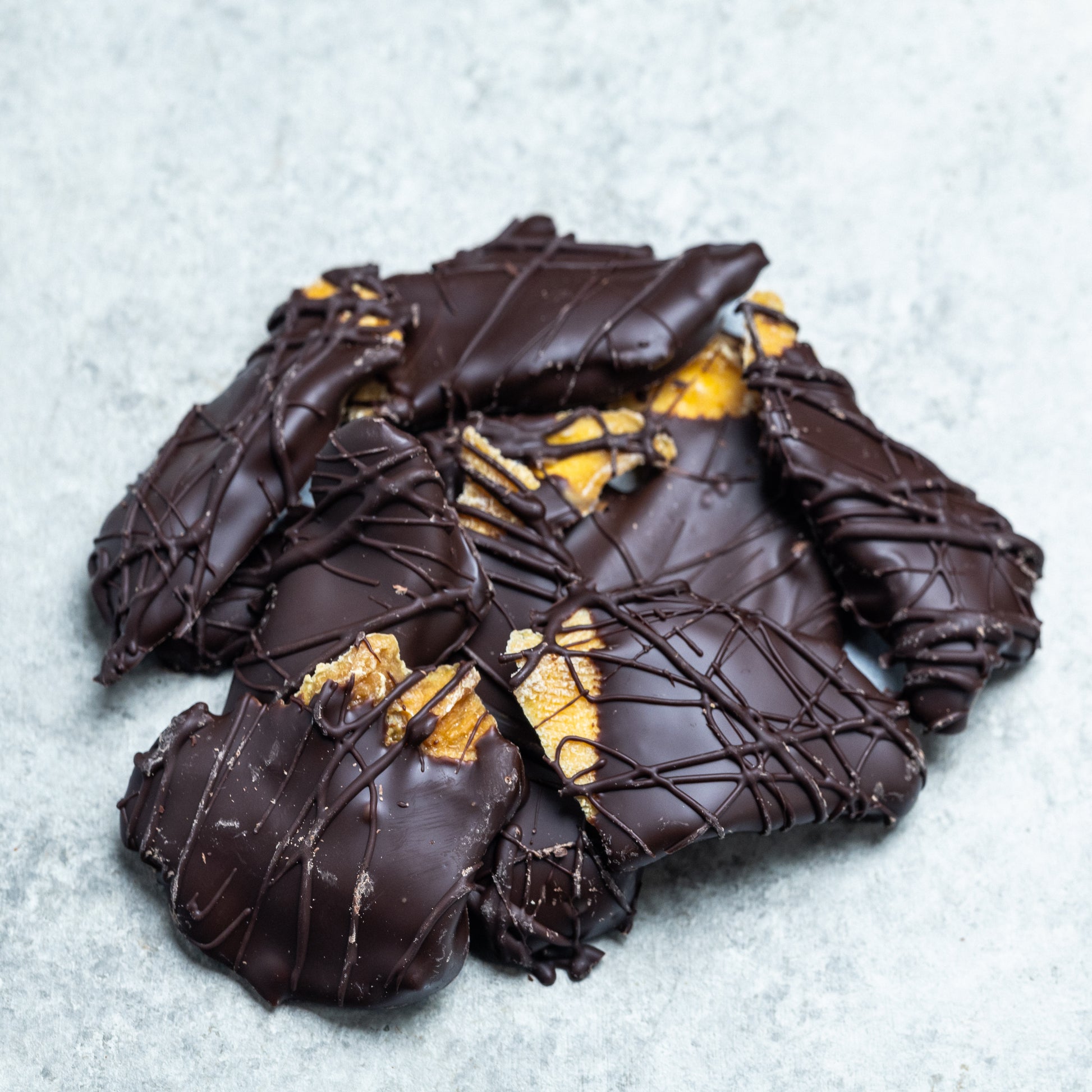 A popular choice for the gift baskets, or a sweet, healthy treat. Dried mango slices dipped in a semi-sweet dark & smooth chocolate. 100g bags
